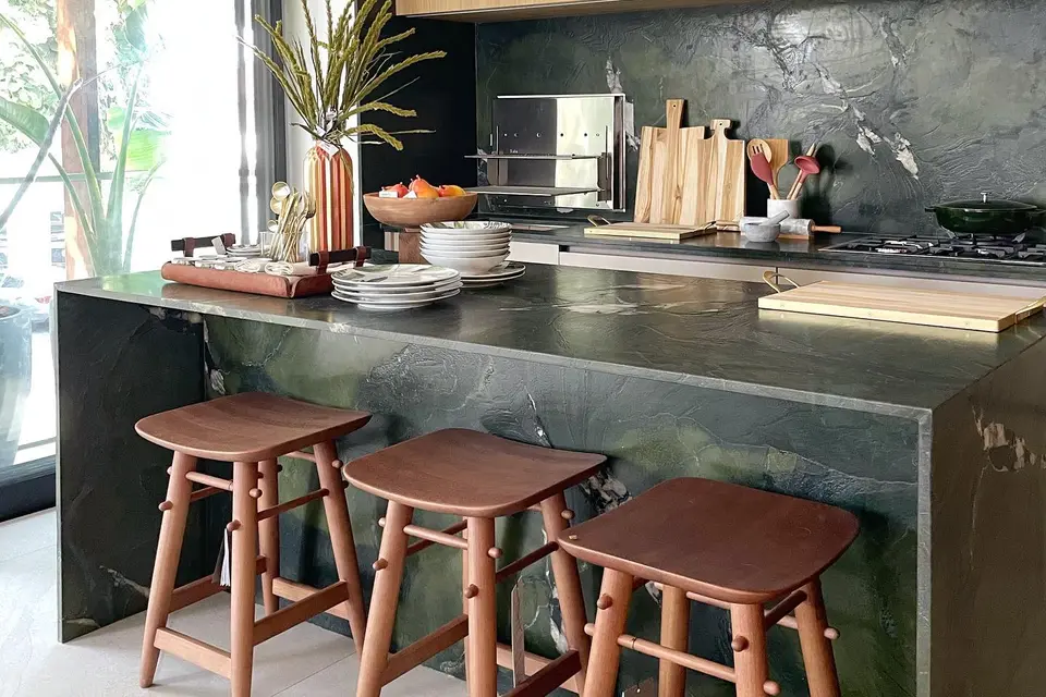 Масивний кухонний острів із цільним каменем підкреслює статус простору та забезпечує високу зносостійкість у щоденному вимірі.