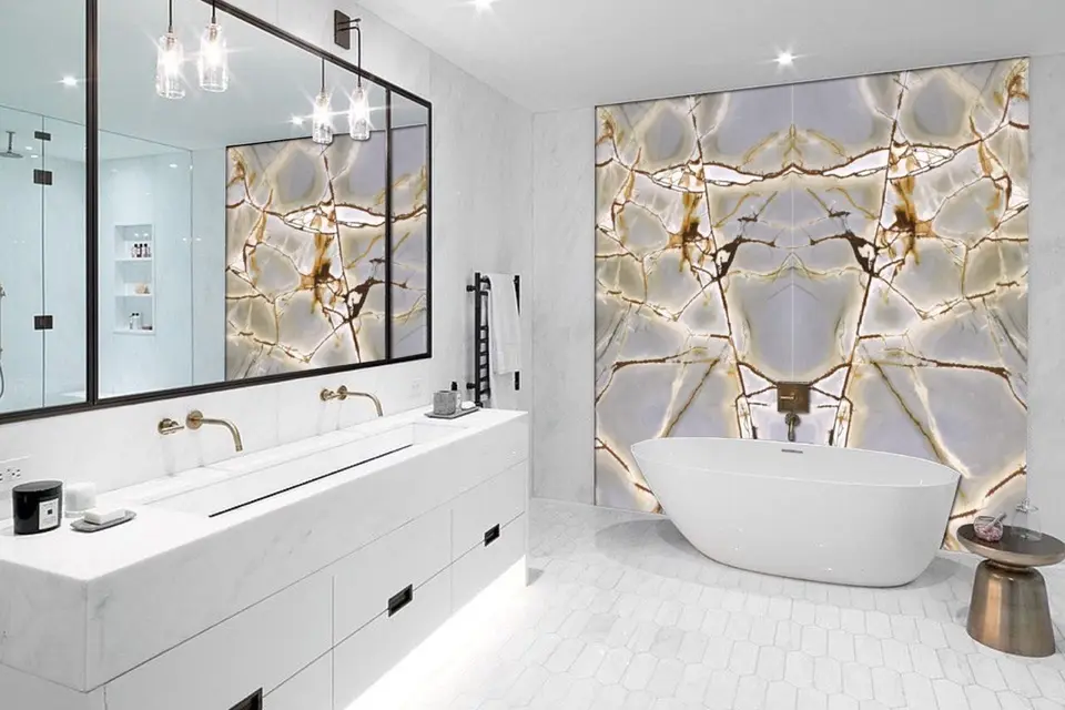 Кожен елемент має унікальний природний малюнок, який перетворює поверхні на справжній арт-об’єкт. Використання великоформатних слебів дозволяє створювати цілісні композиції з мінімальною кількістю швів, підкреслюючи красу натурального каменю.