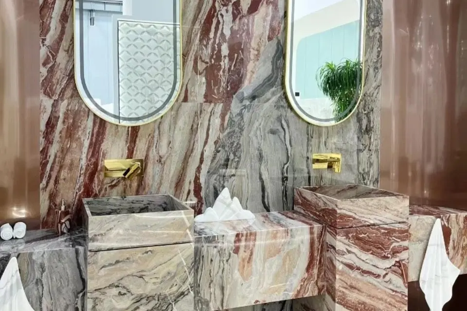 Ванна кімната з мармуром Arabescato Orobico Rosso це простір, у якому природна естетика стає головним акцентом інтер'єру. Динамічний малюнок каменю зі з’єднанням глибоких бордових, сірих і кремових відтінків створює ефект живої текстури, що робить